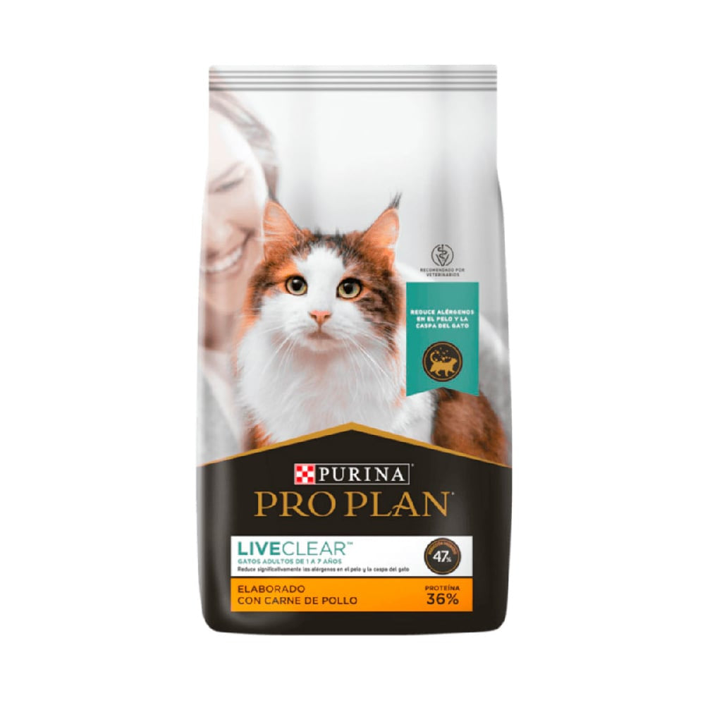 Pro Plan LiveClear es una innovación revolucionaria en la nutrición felina. Es el primer y único alimento científicamente probado que reduce los alérgenos en el pelo y la caspa del gato. Formulado con pollo como primer ingrediente, mantiene una nutrición completa y balanceada, mientras ayuda a disminuir la cantidad del alérgeno Fel d1, responsable de la mayoría de las alergias en humanos, hasta en un 47% desde la tercera semana de uso diario.